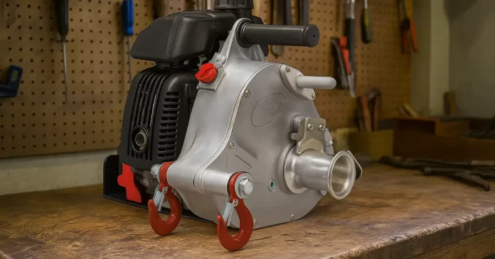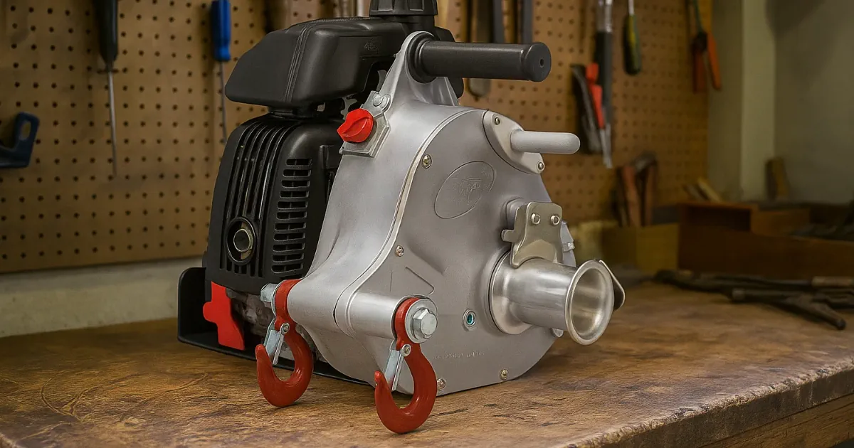 Denna vinsch är en bärbar, bensindriven friktionsvinsch som används för att dra tunga laster. Den fungerar genom att använda en roterande trumma som, när repet är lindat runt den, genererar friktion som möjliggör dragning av föremål. Den är populär inom skogsbruk, jakt och räddningstjänster på grund av dess bärbarhet och styrka.